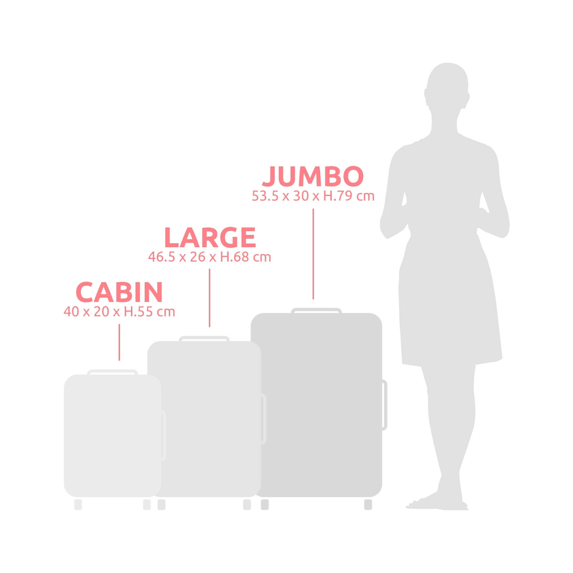 Chaque valise contient un sac de compression réutilisable équipé de deux valves anti-retour et d’un zip avec curseur intégré. L’air peut être expulsé à l’aide de la pompe manuelle fournie ou d’un aspirateur, pour des vêtements parfaitement compressés sans les abîmer. Ce lot comporte trois dimensions différentes cabine : 40 x 20 x 55 cm, la taille L : 46,5 x 26 x 68 cm et la taille XL : 54,5 x 32 x 81 cm