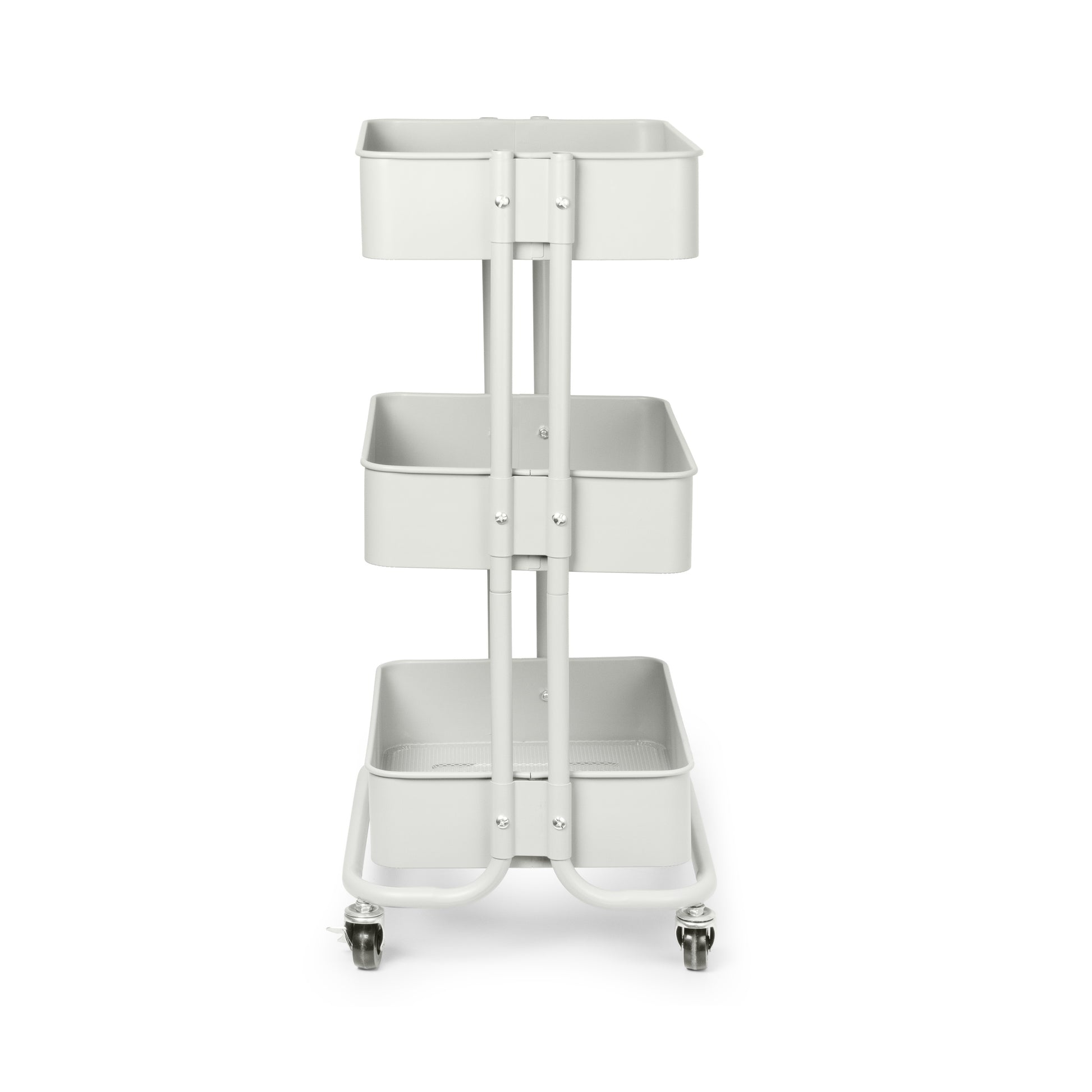 Carrito con ruedas de 3 niveles de la colección Grena. Ideal para la cocina, ideal para guardar utensilios, alimentos secos y también alimentos como ajo y cebolla. También se puede usar en el baño, la oficina, etc. Está fabricado íntegramente en metal (no usar en exteriores) y cada estante está perforado. Sus 4 ruedas facilitan su desplazamiento y cuentan con frenos para mayor estabilidad. Dimensiones: 43 x 36,5 x 78 cm. Limpiar con un paño húmedo.