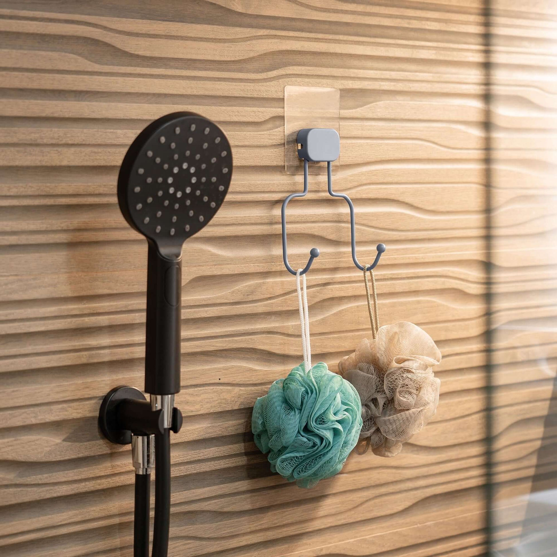 Este gancho doble está fabricado en metal con acabado epoxi color gris azulado; El parche de fijación transparente está fabricado en SEBS y PET. Dimensiones: 10 x 5 x H.18 cm. Impermeabilidad garantizada. Soporta hasta 3 kg. Se adjuntan instrucciones de montaje.