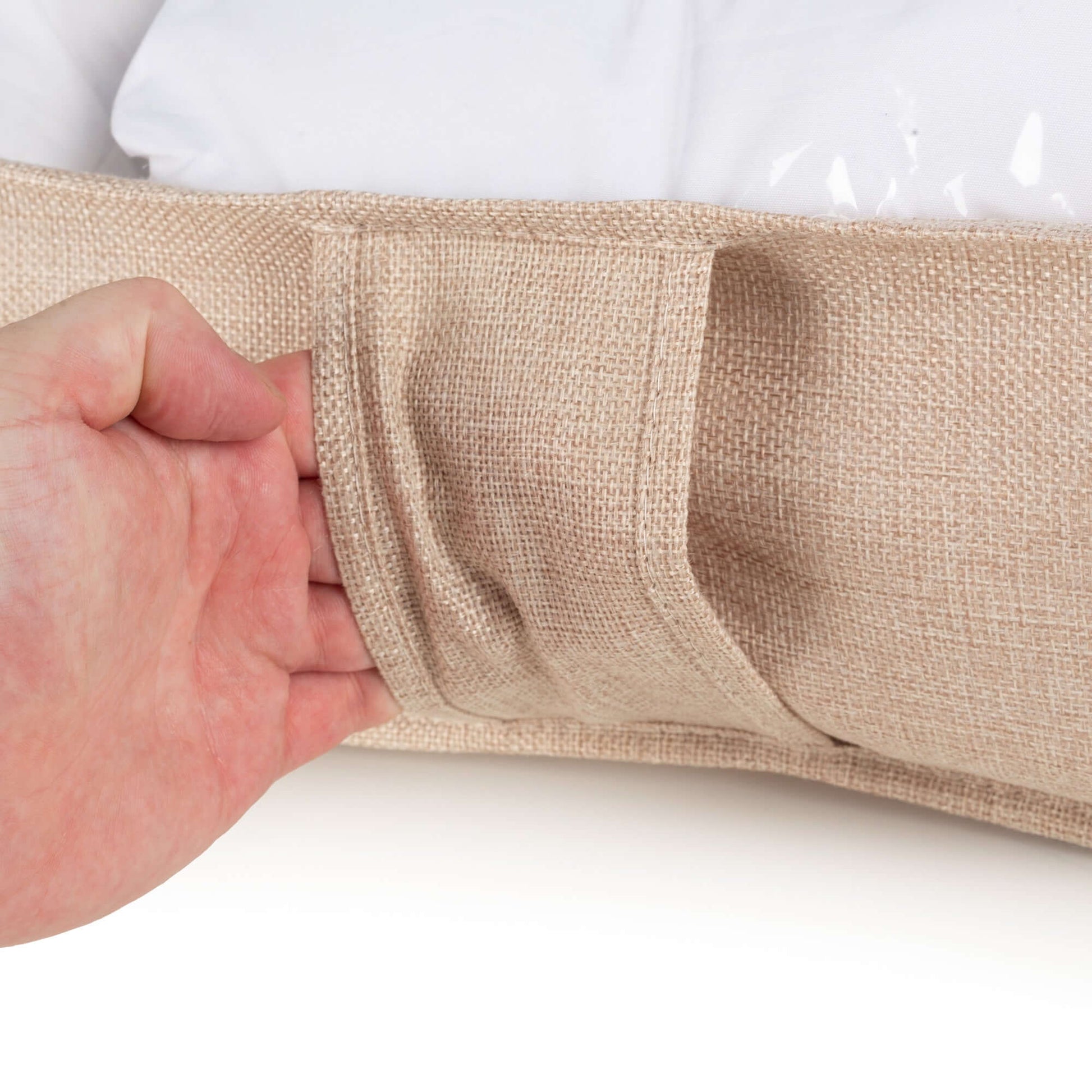 Fabricada en poliéster con aspecto de lino, combina suavidad, resistencia y elegancia natural. Su ventana transparente de PEVA permite identificar el contenido de un vistazo sin necesidad de abrir la tapa. Las asas laterales reforzadas facilitan su transporte y manejo diario.