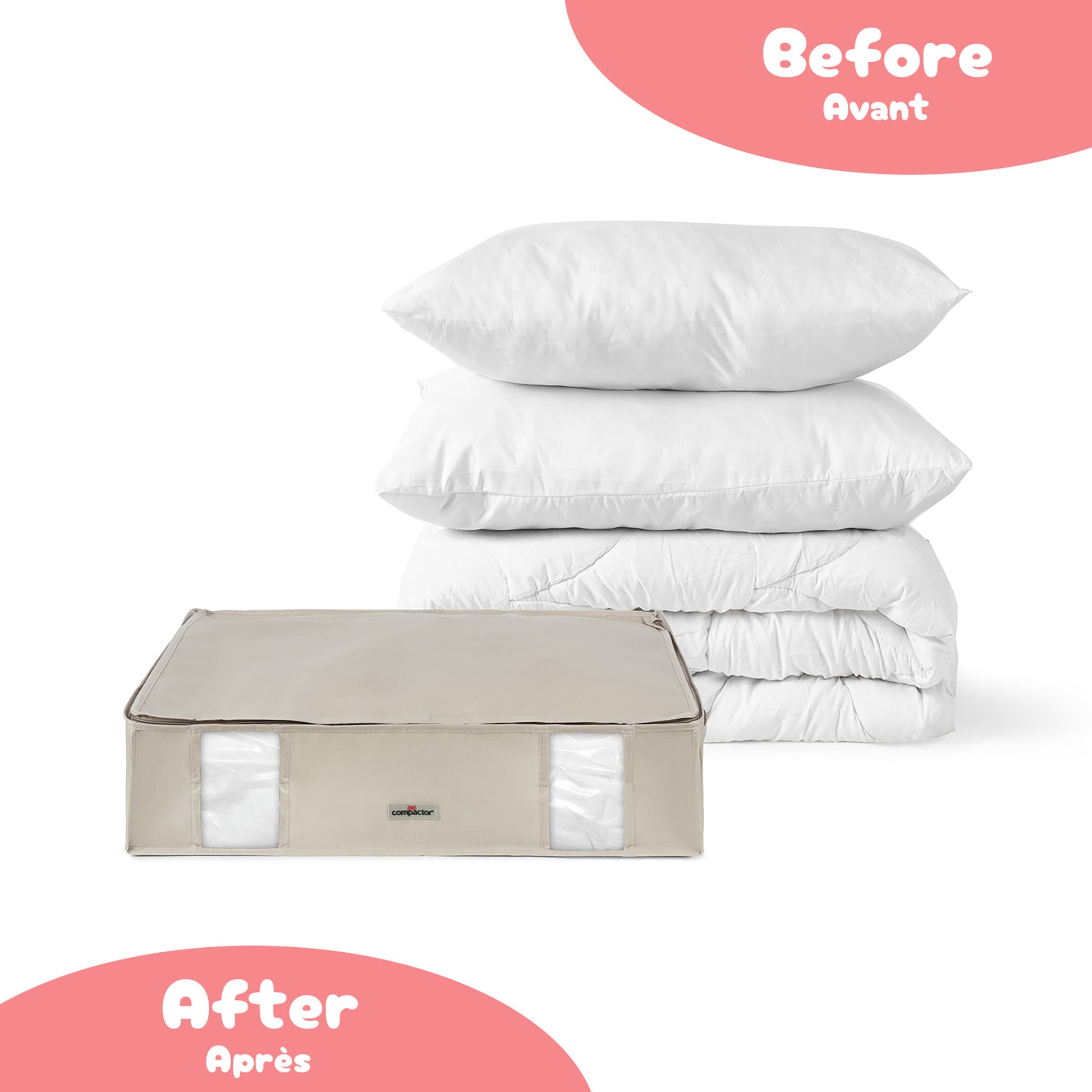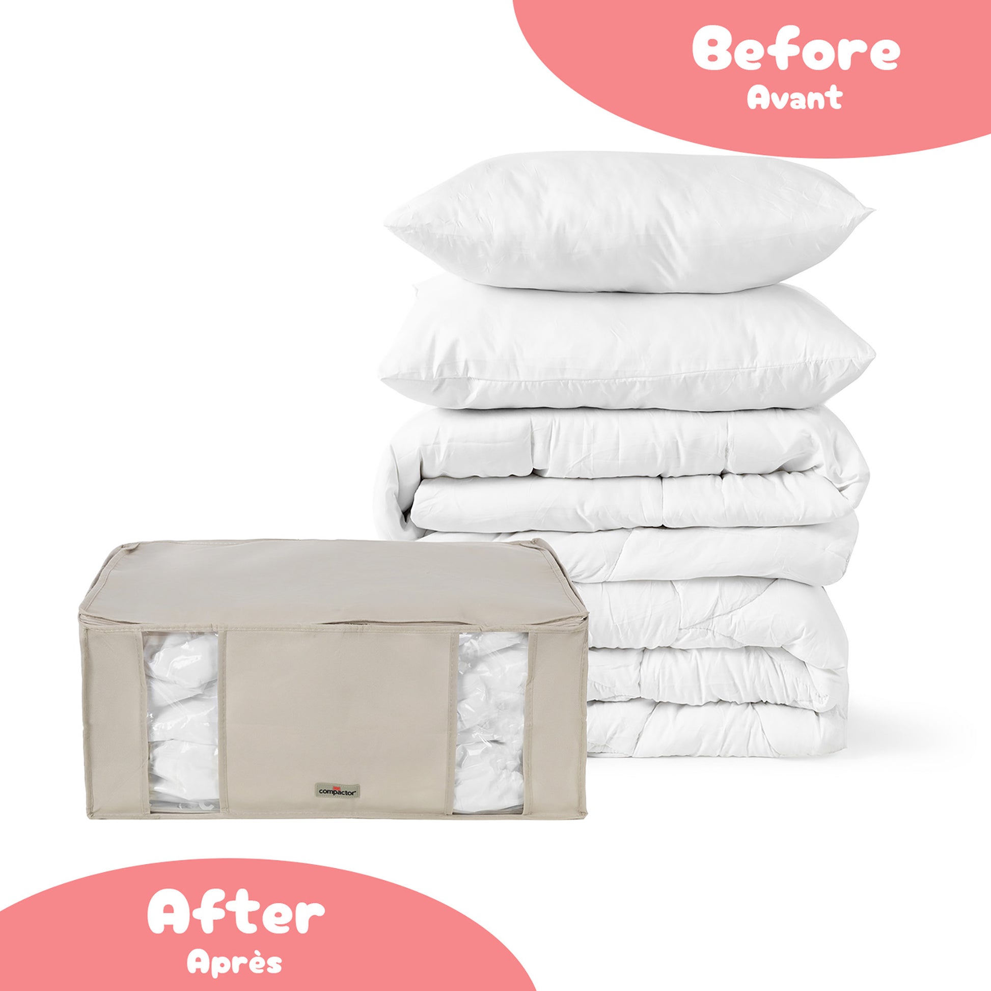 Elige la talla que mejor se adapte a tus necesidades: la talla L (54,5 x 43,5 x 17,5 cm) es perfecta para dos almohadas y uno individual. La talla XL (54,5 x 43,5 x 32,5 cm) está diseñada para dos edredones dobles y uno individual.