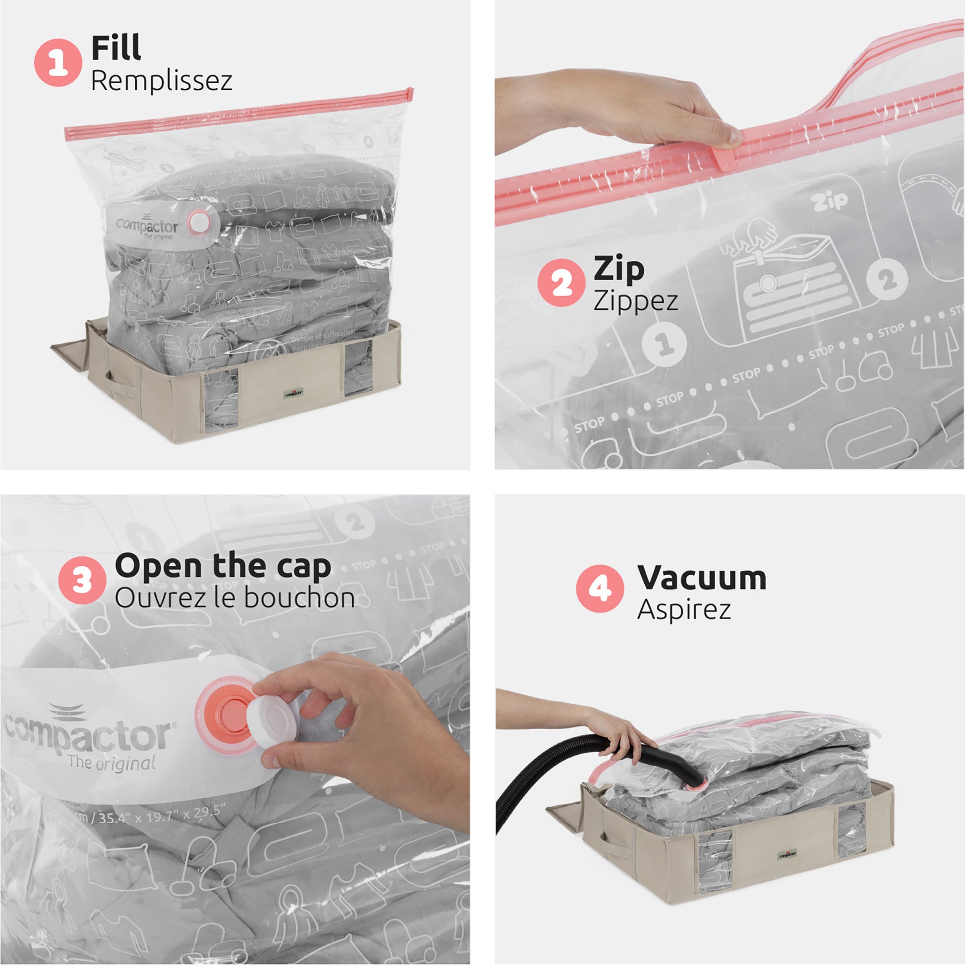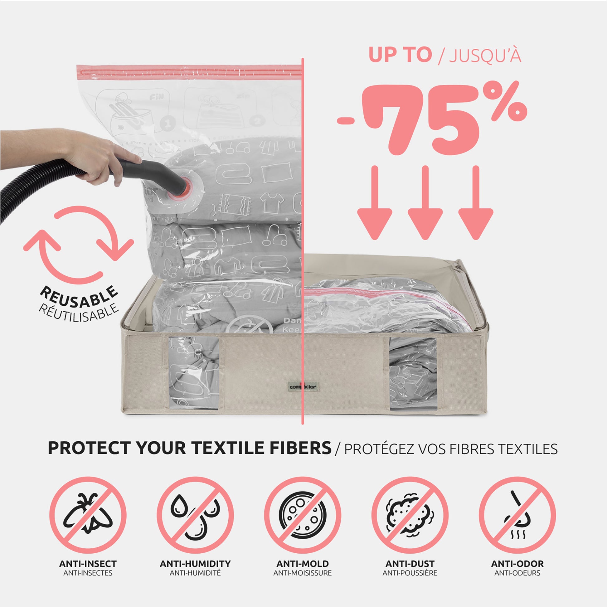 - Comprime instantáneamente tus textiles con cualquier aspiradora equipada con una manguera flexible.