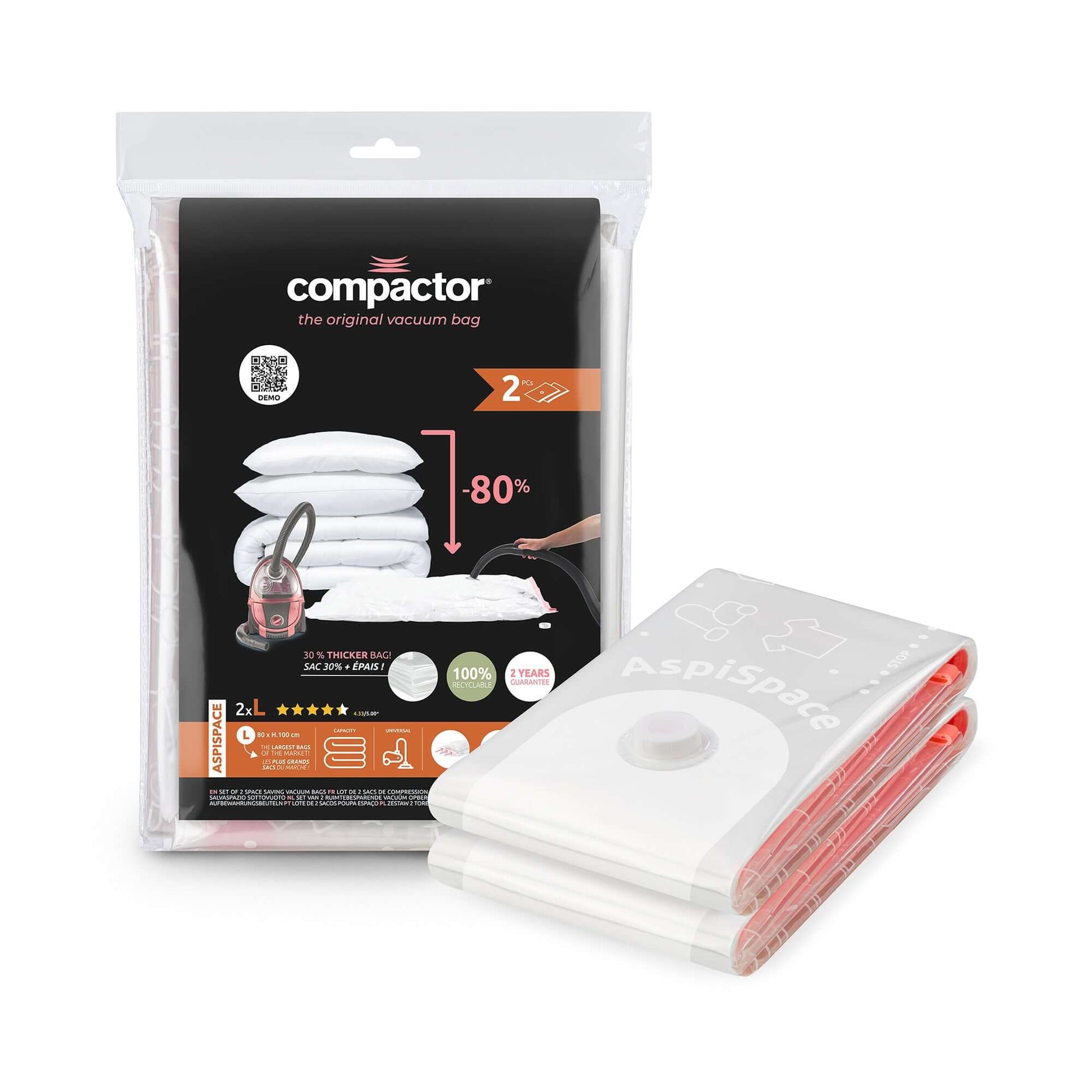 Libera espacio fácilmente con este juego de 2 bolsas de almacenamiento al vacío Compactor, ideales para optimizar el almacenamiento en casa o de viaje. Una vez extraído el aire, tus prendas se mantienen comprimidas durante más tiempo y quedan perfectamente protegidas.