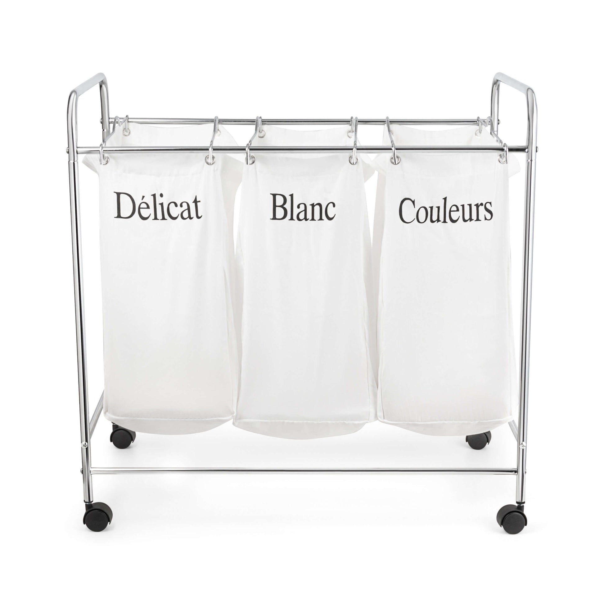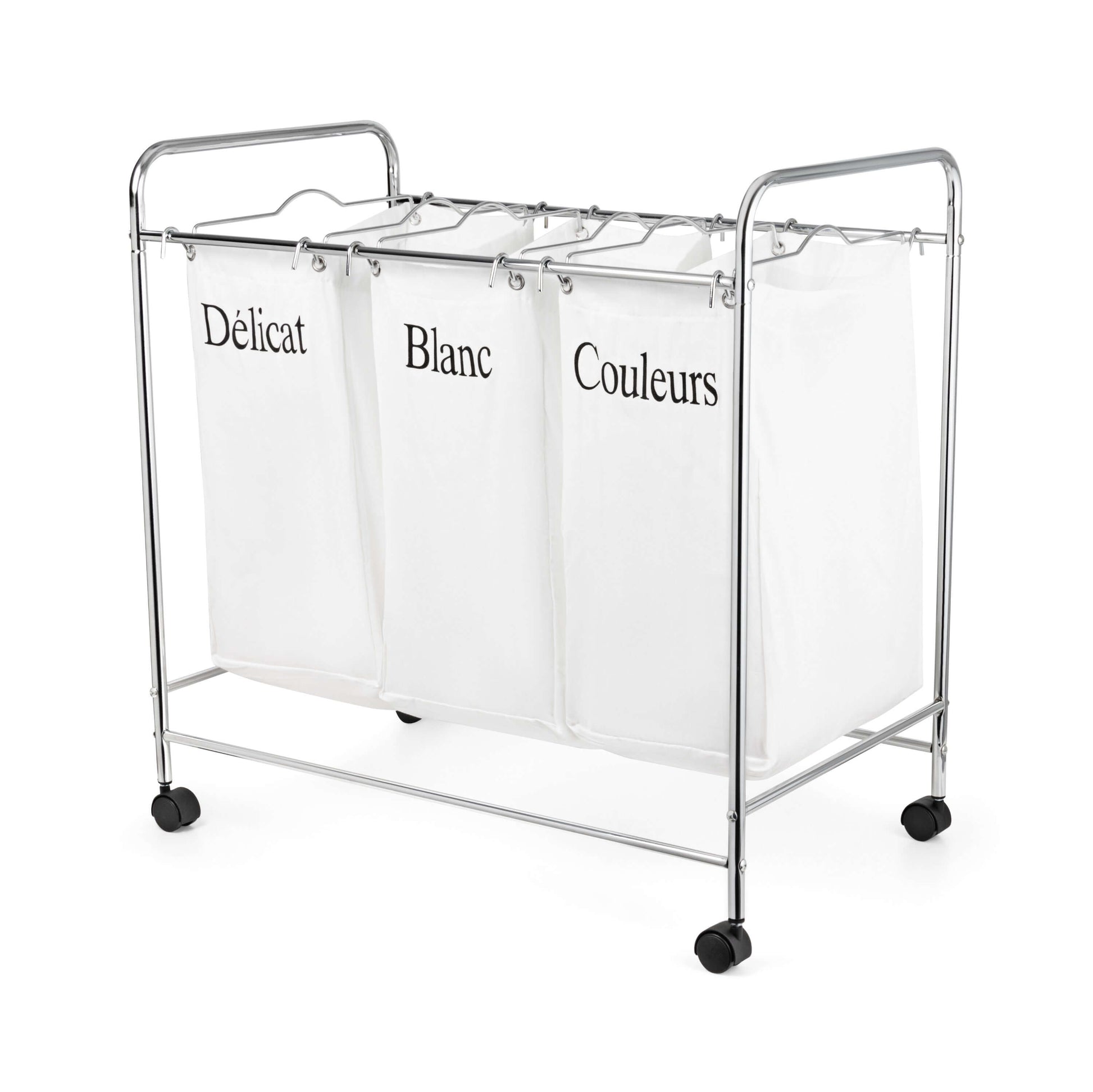La estructura de este cesto para la ropa sucia es de metal cromado, los 3 compartimentos son de polialgodón blanco. Las ruedas giratorias te permitirán mover el cesto de la ropa sucia de una habitación a otra o simplemente acercarlo a la lavadora para que sea más fácil meterlo en la máquina.
