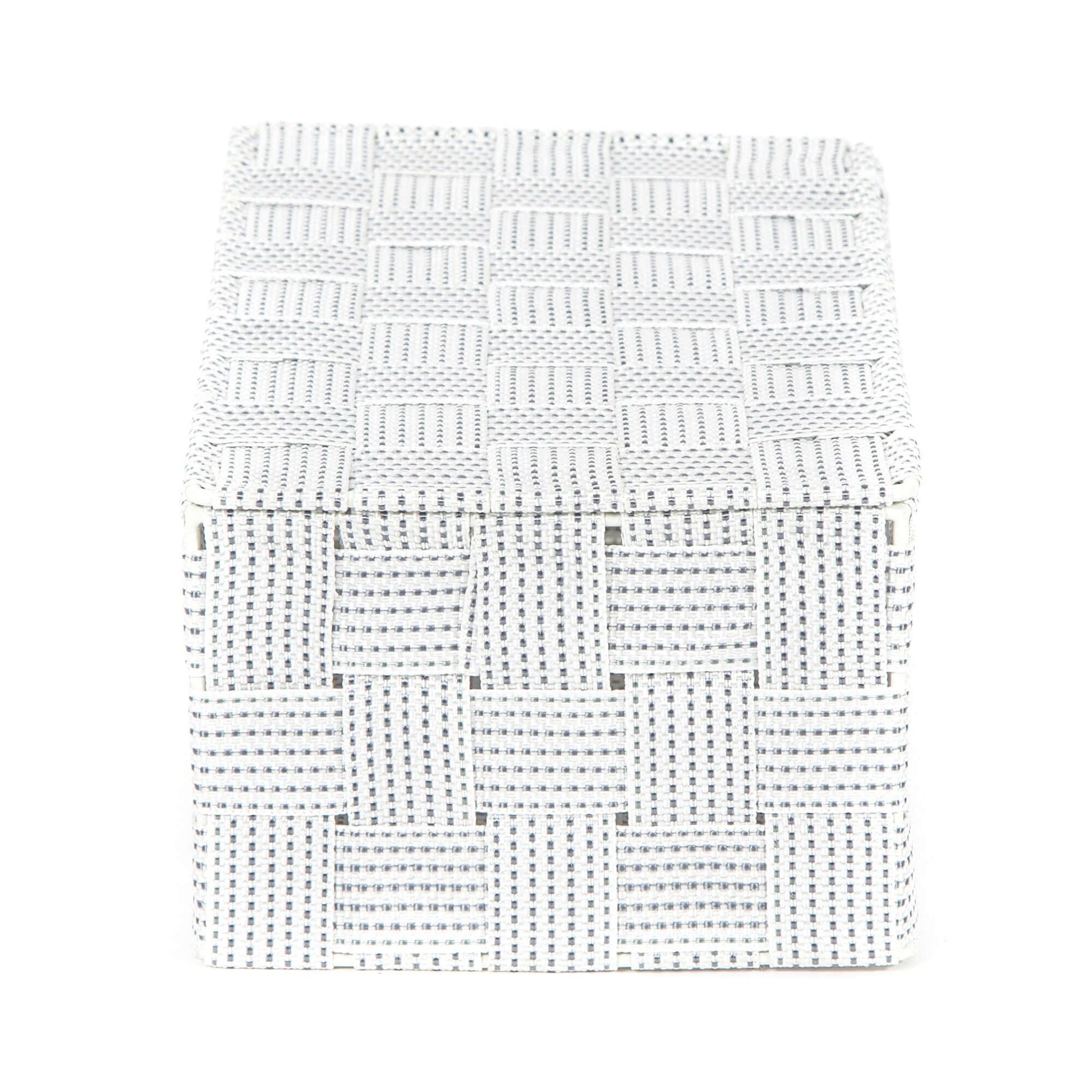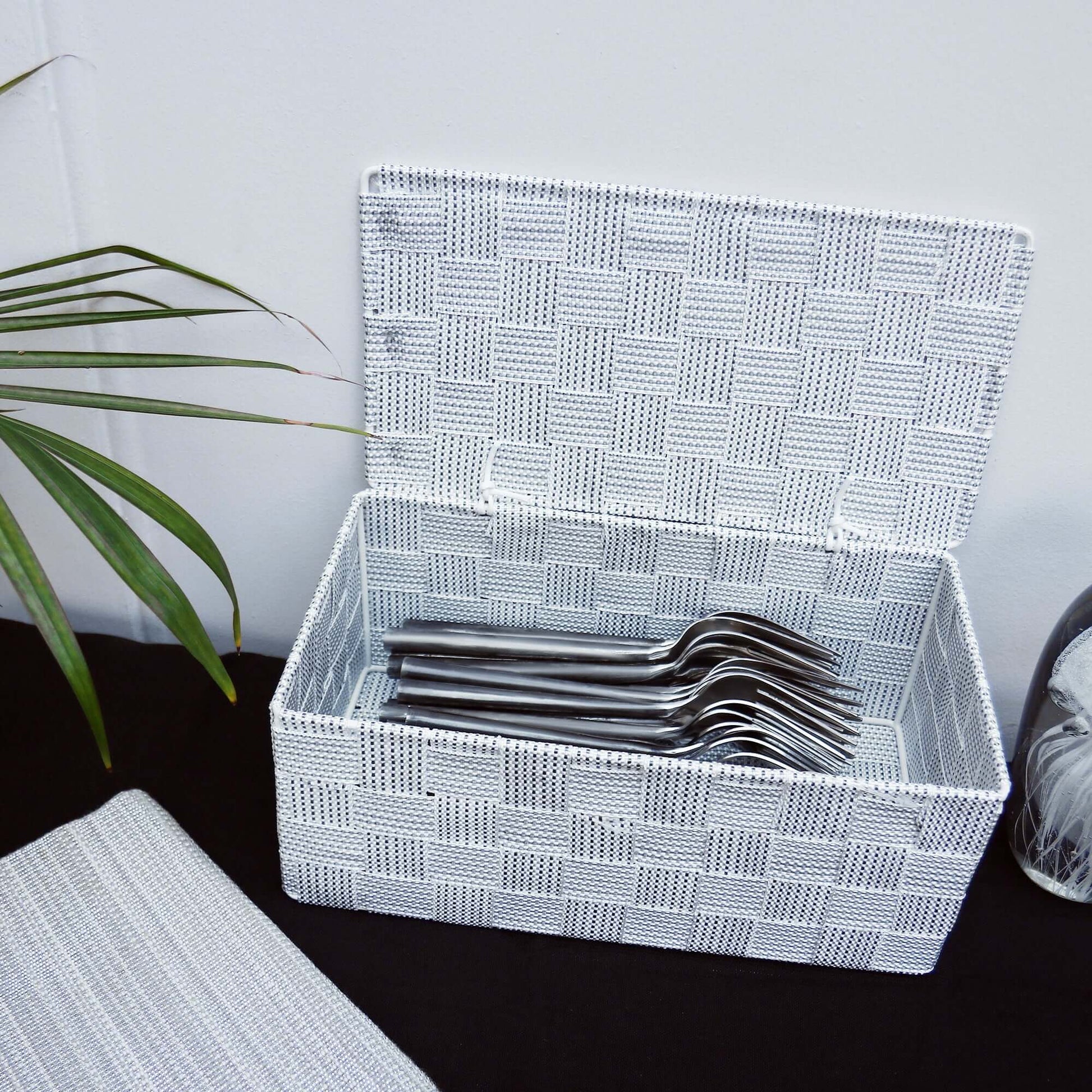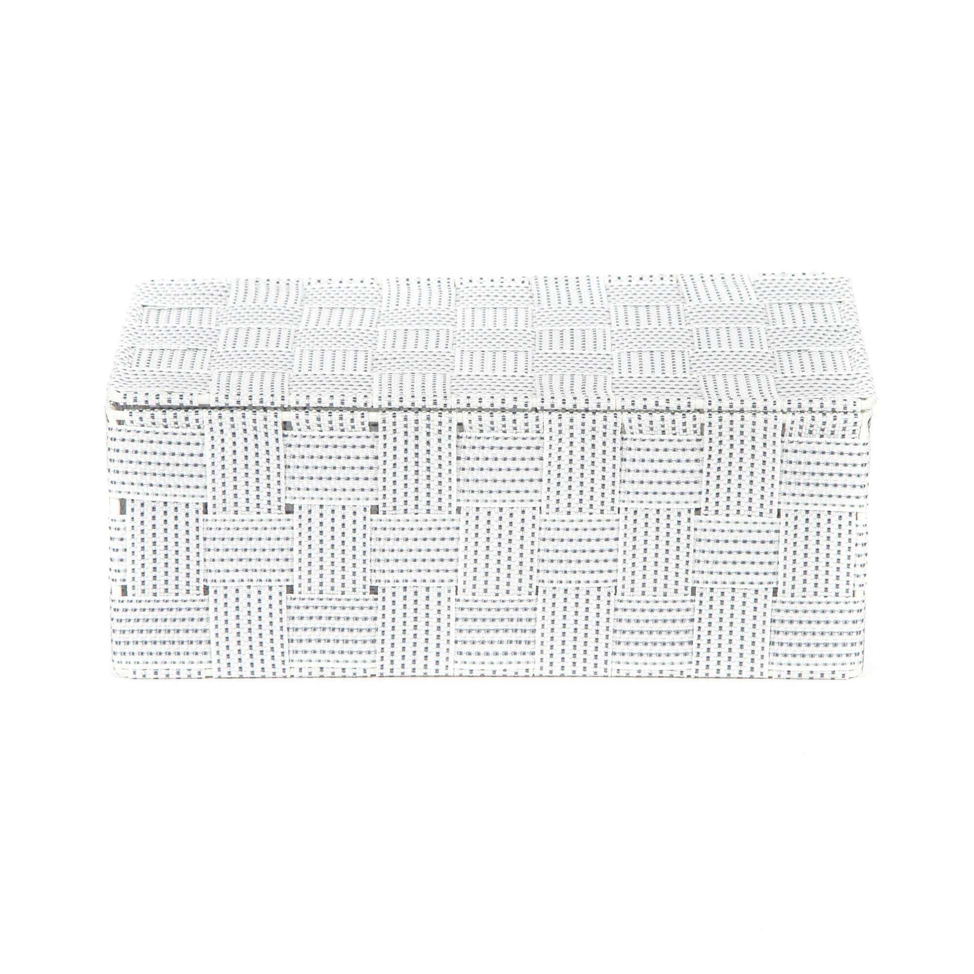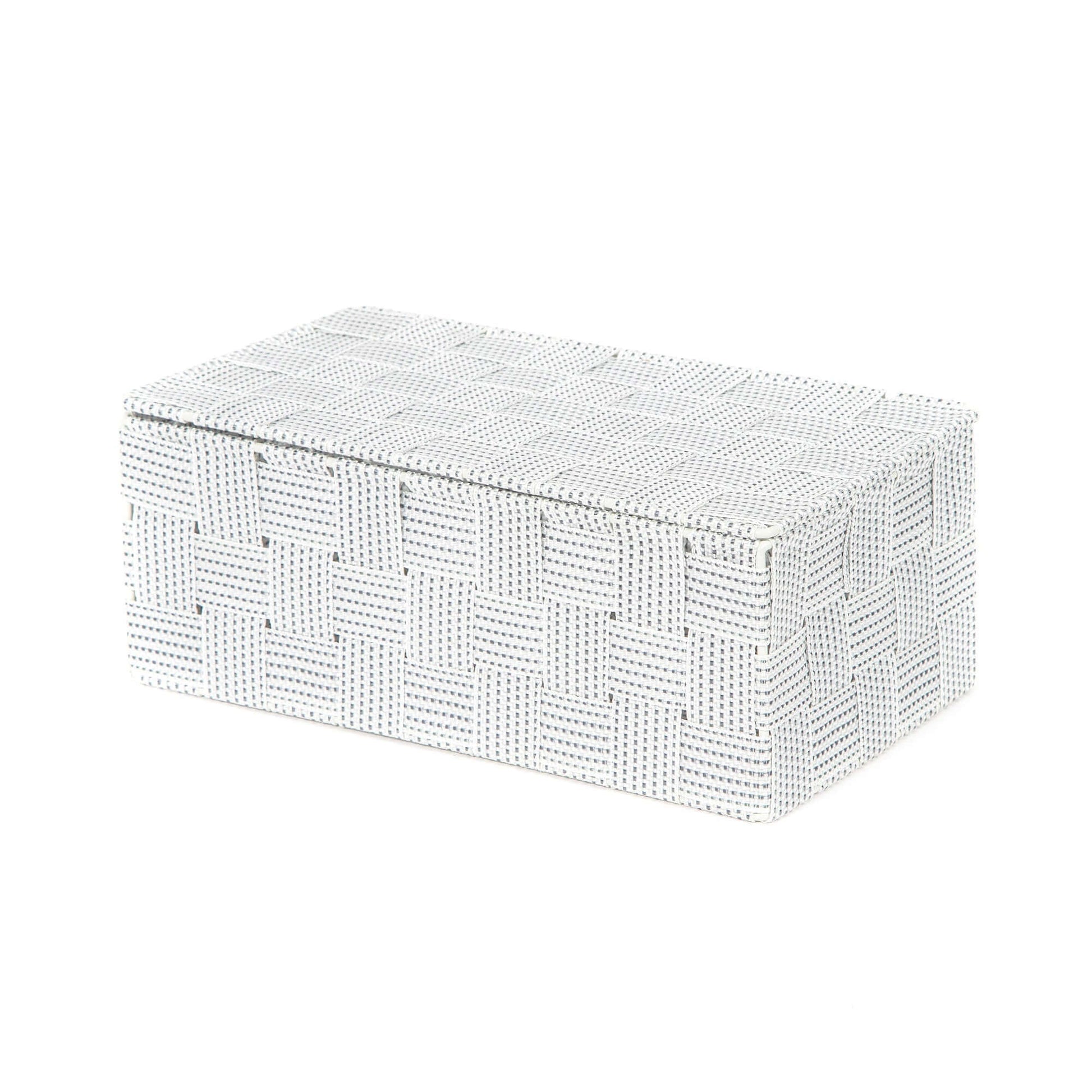 Esta caja de correas trenzadas, provista de tapa, te permitirá guardar productos de belleza y maquillaje en el baño así como tus joyas o lencería y complementos en el vestidor. También servirá para guardar guantes y bufandas en la entrada y todos esos pequeños objetos que abarrotan la oficina: así será más fácil encontrar cables, auriculares, bombillas de repuesto cuidadosamente agrupados. Fabricada con correas finamente moteadas, esta caja está consolidada por un marco de metal. Combinado con otras cestas y cajas Toronto, le permitirá crear un almacenamiento armonioso y verdaderamente práctico.