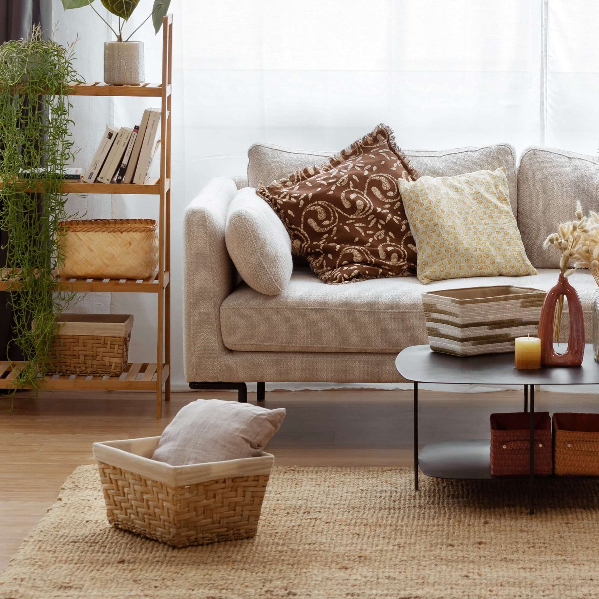 - Confectionné à la main, chaque panier est unique. Les légères variations de forme et de couleur sont une caractéristique de la fibre naturelle