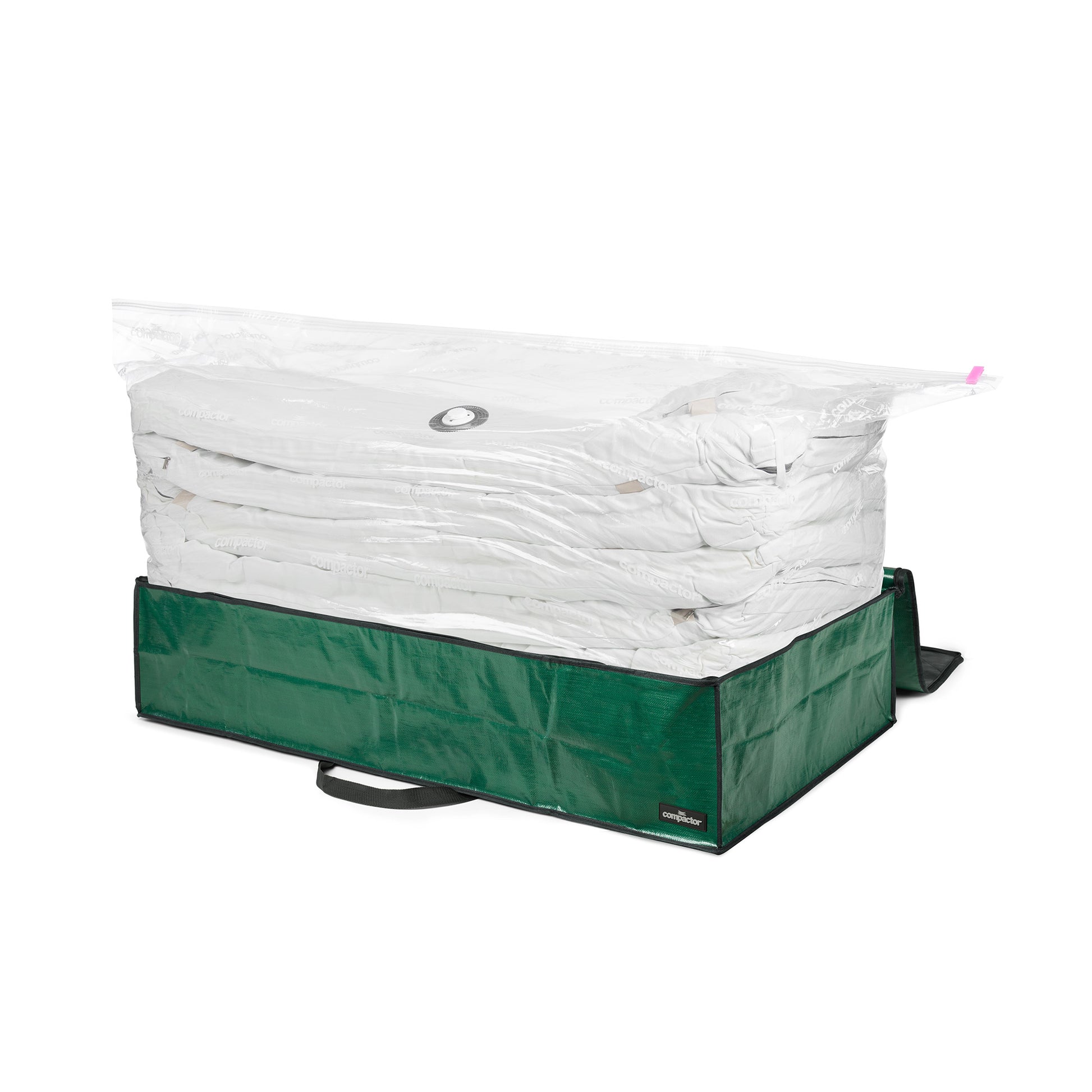 À l’intérieur, le sac de compression bénéficie de la technologie brevetée Compactor, une mise sous vide 30 % plus rapide grâce à une valve ultra-performante, et un sac 30 % plus épais pour une résistance renforcée. La housse extérieure est fabriquée en PE (100 %). Le sac de compression en PE (14 %), PET (83 %), silicone (3 %). Elle est dotée de deux poignées robustes pour faciliter les manipulations, même lorsqu’elle est pleine. Valve universelle compatible avec tout aspirateur muni d’un tuyau flexible.