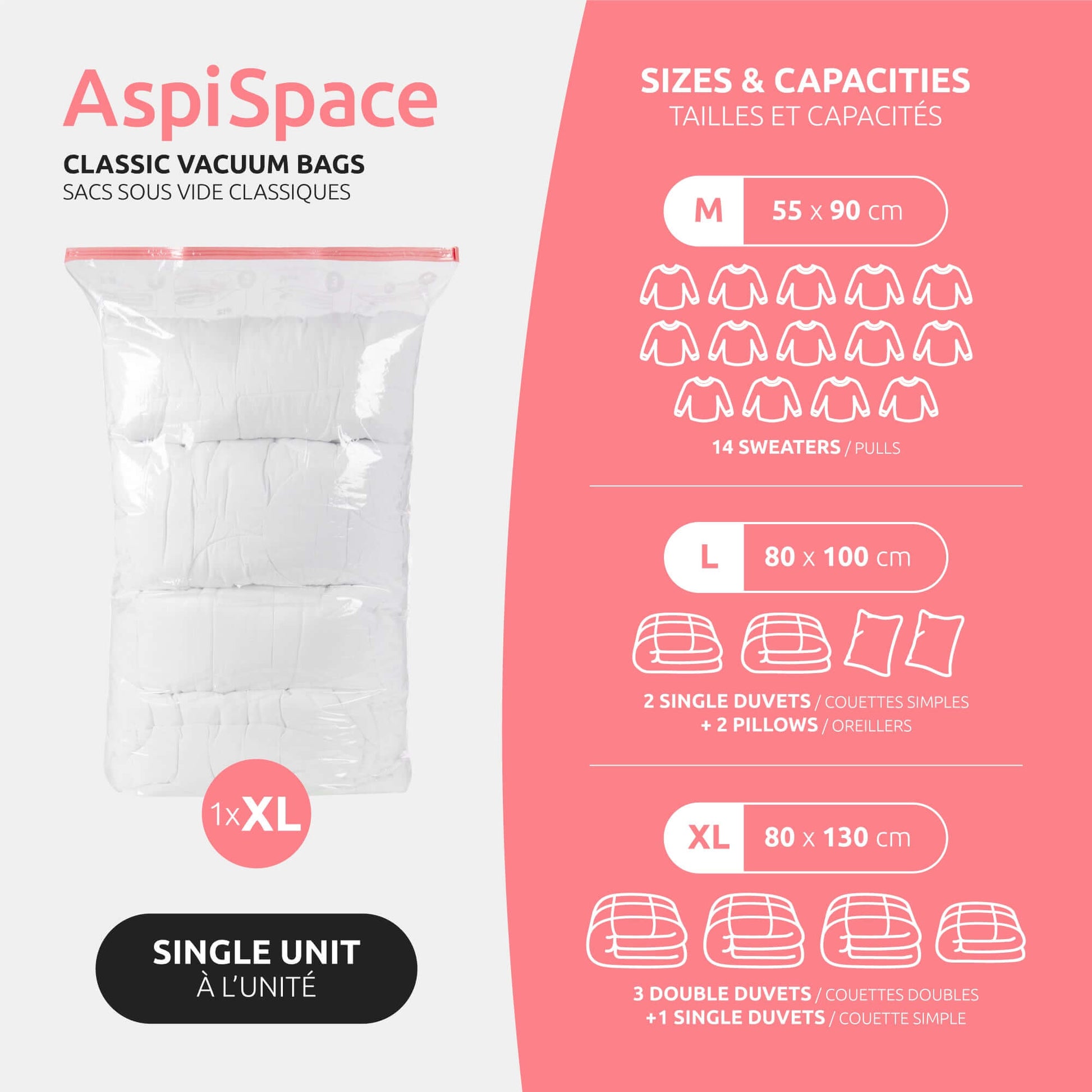 - Gagnez jusqu’à 80% d’espace dans vos armoires, sous les lits, en voyage