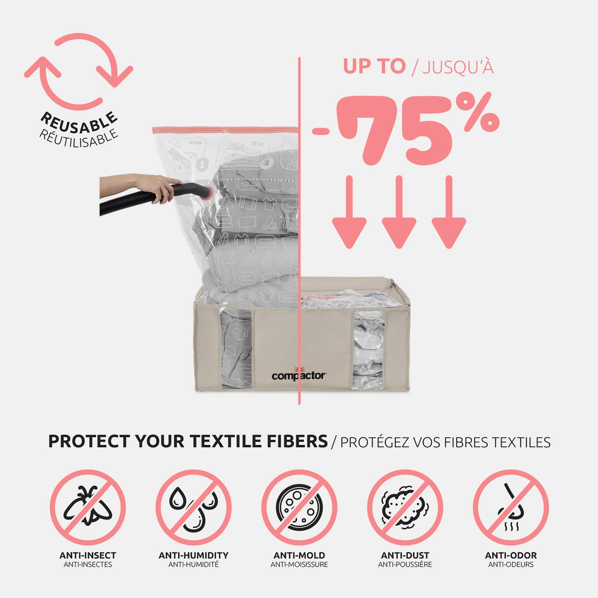 La valve intégrée fonctionne avec tout aspirateur équipé d’un tuyau flexible. En quelques instants, l’air est aspiré, la housse se compacte uniformément et conserve son format optimisé. Vos textiles bénéficient d’une protection hermétique efficace contre la poussière, l’humidité, les mites et les acariens.