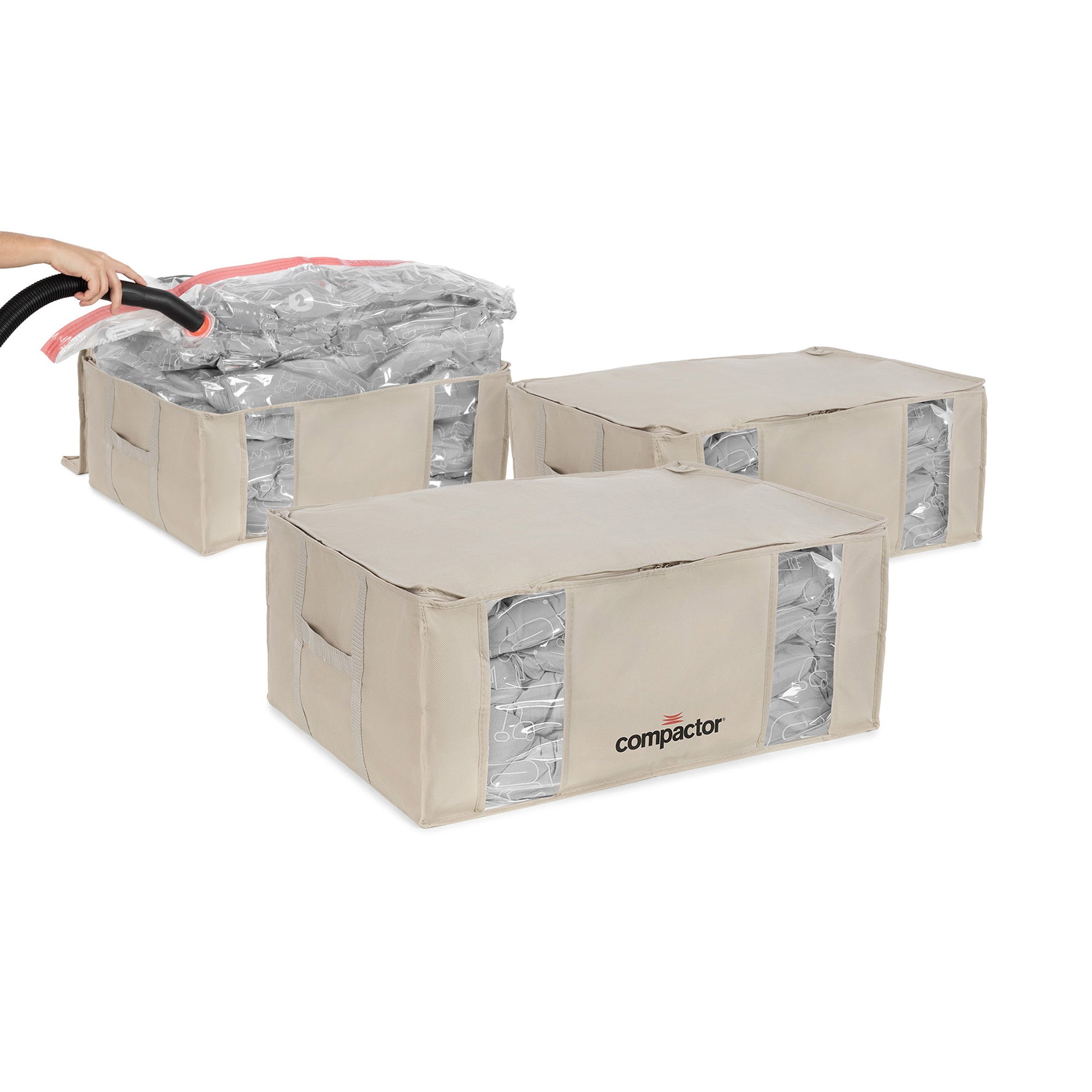 Avec leurs dimensions généreuses (65 x 45 x H.27 cm), chaque housse offre une grande capacité de stockage : jusqu’à deux couettes deux personnes et deux oreillers peuvent être compressés et protégés dans un seul contenant. Le Lot 3 housses rangement sous vide XXL convient parfaitement au rangement saisonnier ou au stockage longue durée.