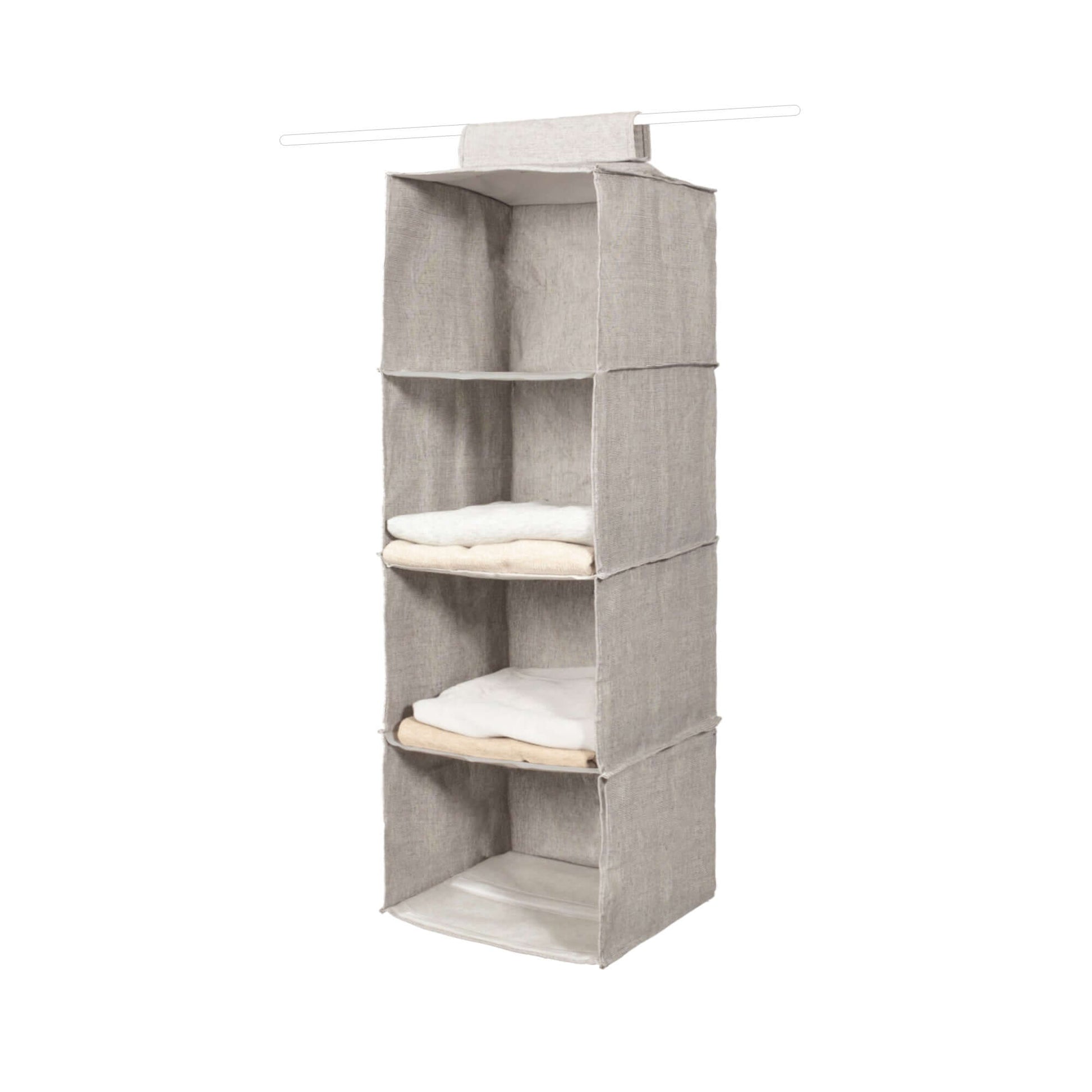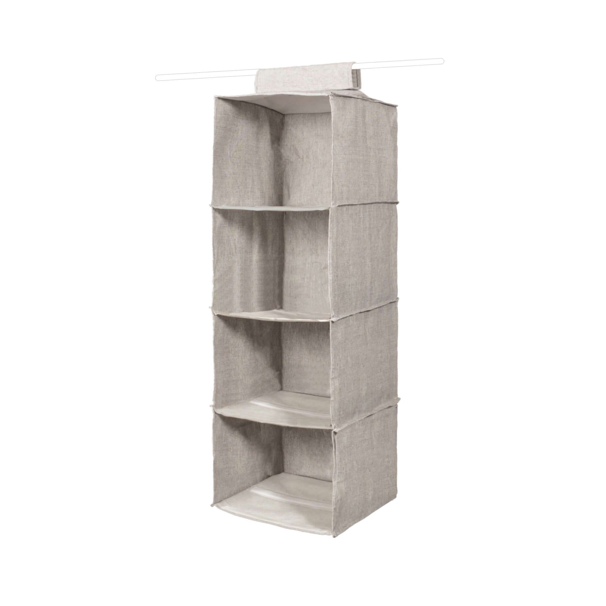 Créez du rangement en plus grâce à cette étagère souple qui se fixe d’un geste sur la barre de penderie ou sur un portant si vous n’avez pas de placard du tout. Avec ses 4 compartiments bien larges, elle vous permettra d’organiser le rangement de vos pulls, sweats, tee-shirts ou linge de maison si l’agencement de votre armoire est mal adapté.