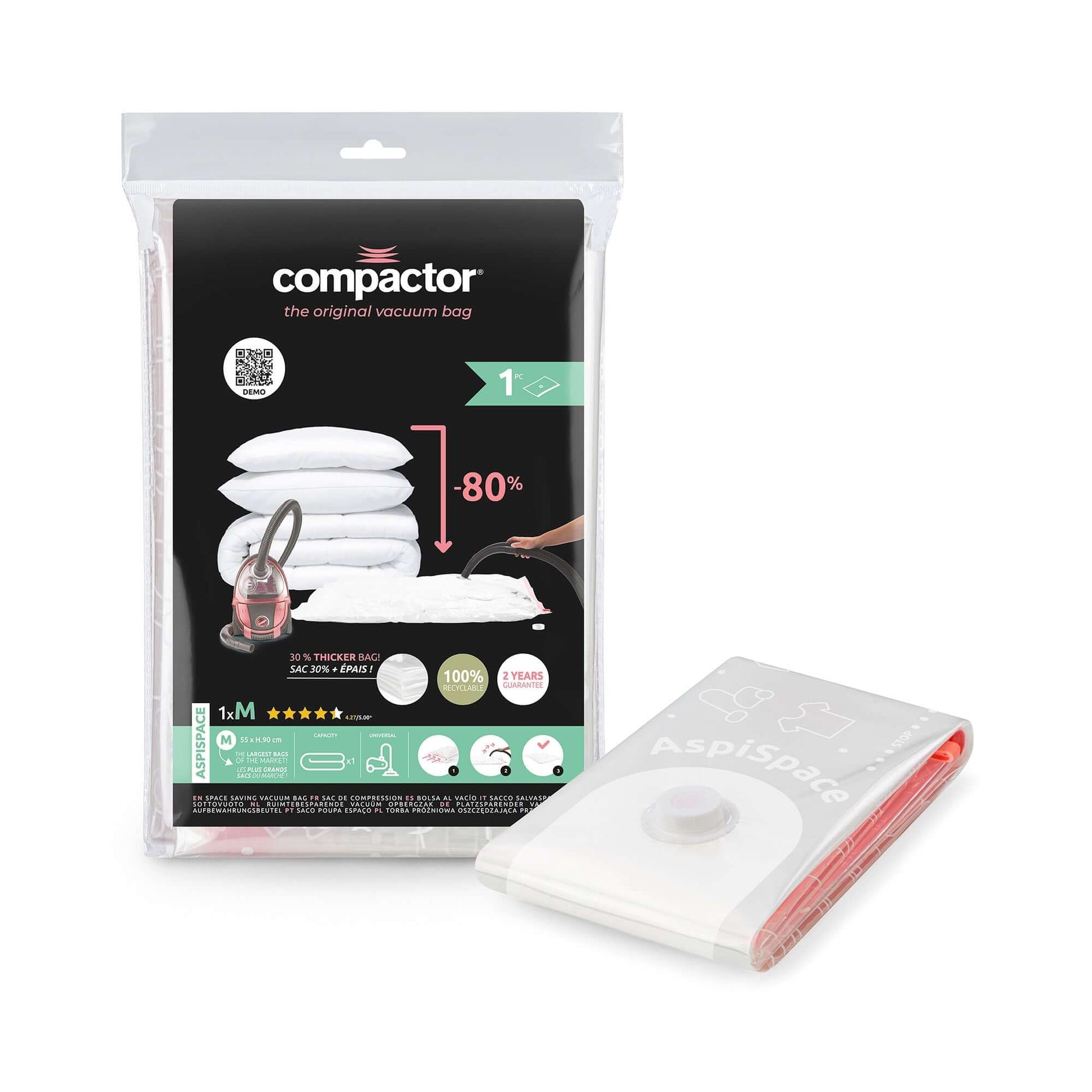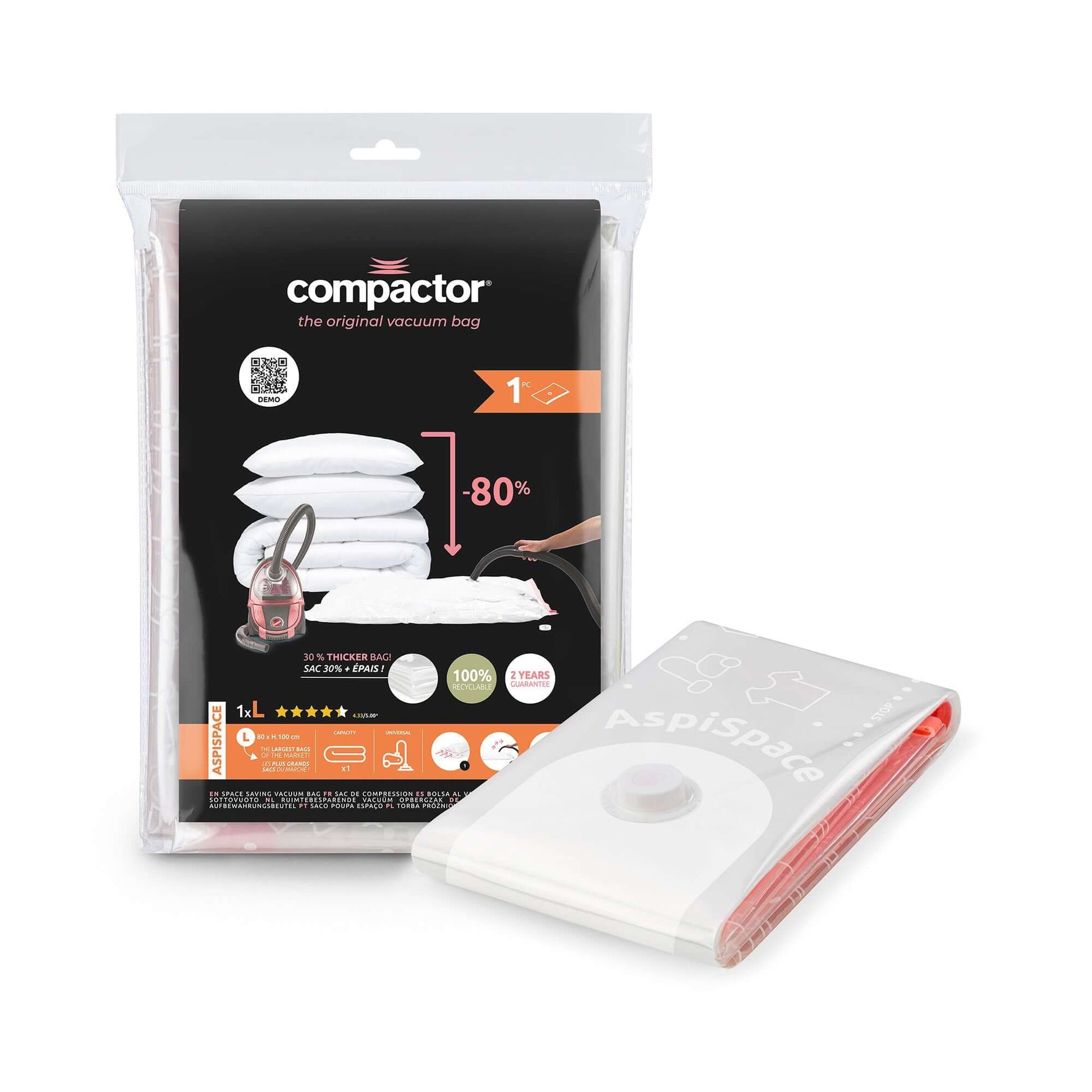 Optimisez vos rangements avec les sacs de compression Compactor. Grâce à leur technologie sous vide brevetée, réduisez jusqu’à 80 % du volume de vos textiles en quelques secondes, tout en les protégeant durablement.