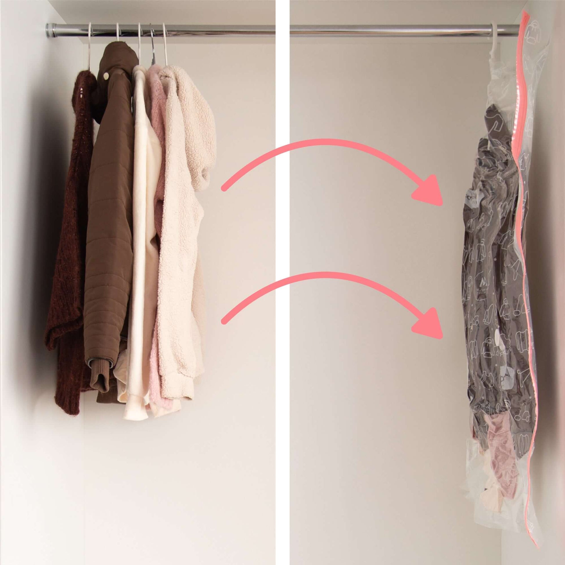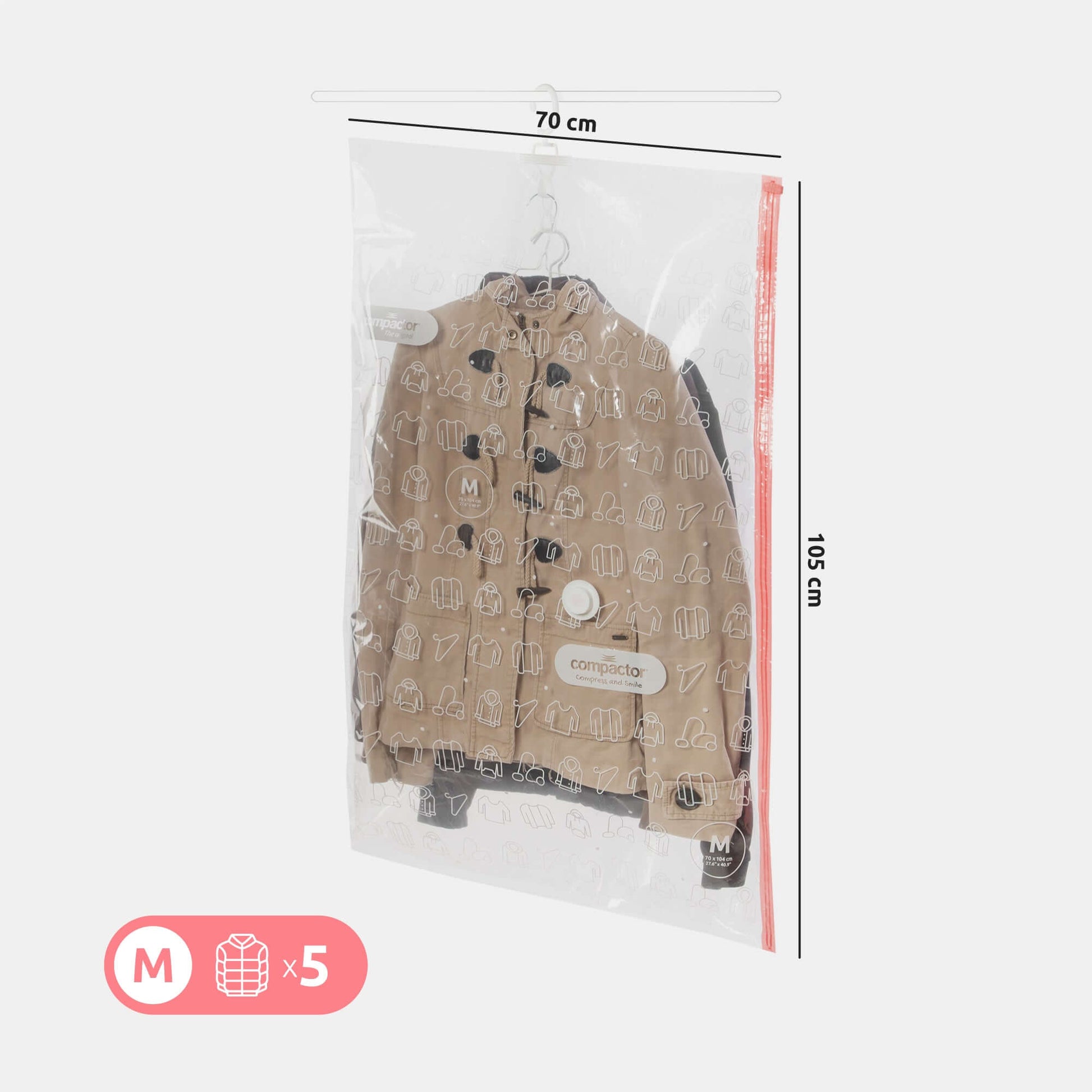Disponible en deux tailles, la taille M (70 x 105 cm) idéal pour stocker jusqu’à 5 vestes, la taille L (70 x 145 cm) peut contenir jusqu'à 5 manteaux. Accrochez vos vêtements sur le cintre intégré avec 4 anneaux de support, zippez, aspirez et c’est rangé ! Le grand côté zippé permet de remplir facilement le sac, et la matière transparente vous aide à repérer le contenu en un coup d’œil.