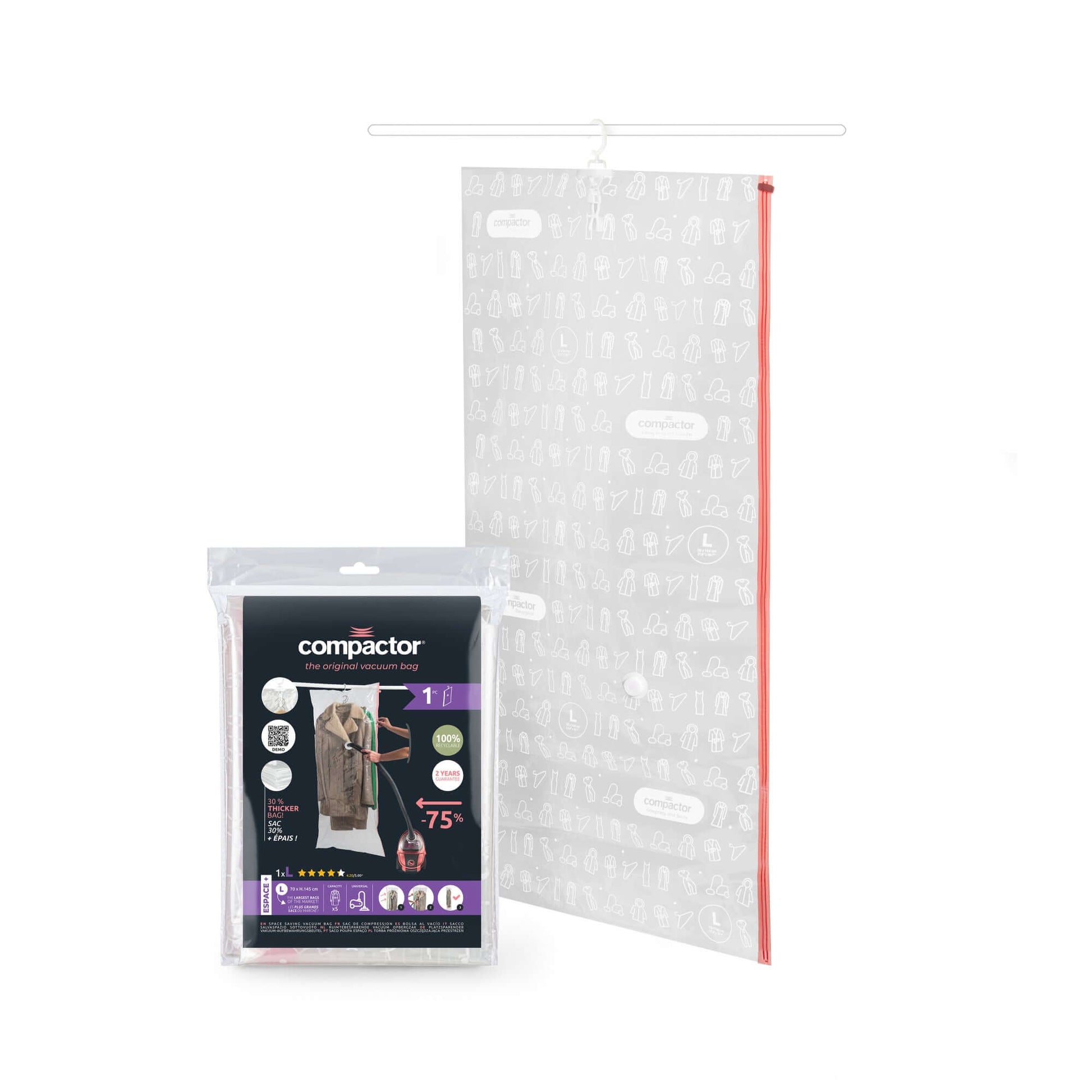 Maximisez l’espace dans vos placards avec ce sac de rangement sous vide à suspendre Compactor, idéal pour stocker doudounes, manteaux ou vêtements saisonniers sans les froisser. En un simple coup d’aspirateur, réduisez leur volume jusqu’à 80 % tout en les gardant accessibles.